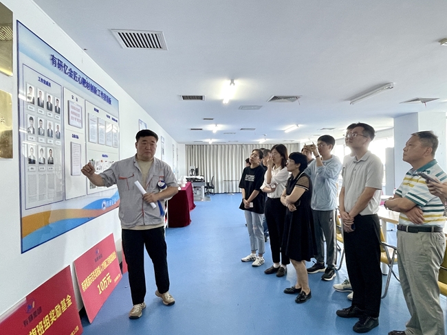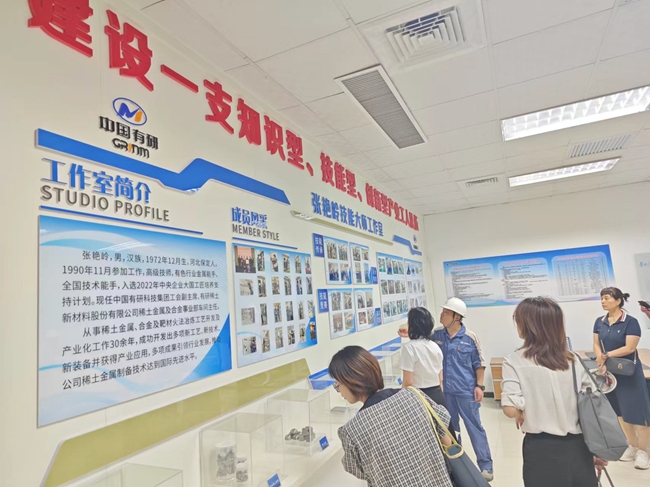 中央企業(yè)技能大師工作室領(lǐng)銜人、全國技術(shù)能手、國務(wù)院特殊津貼專家張艷嶺帶領(lǐng)大家參觀了稀土車間以及工作室,跟大家分享了他帶領(lǐng)工作室成員在工藝路線創(chuàng)新優(yōu)化等方面開展的工作和取得的成績等。