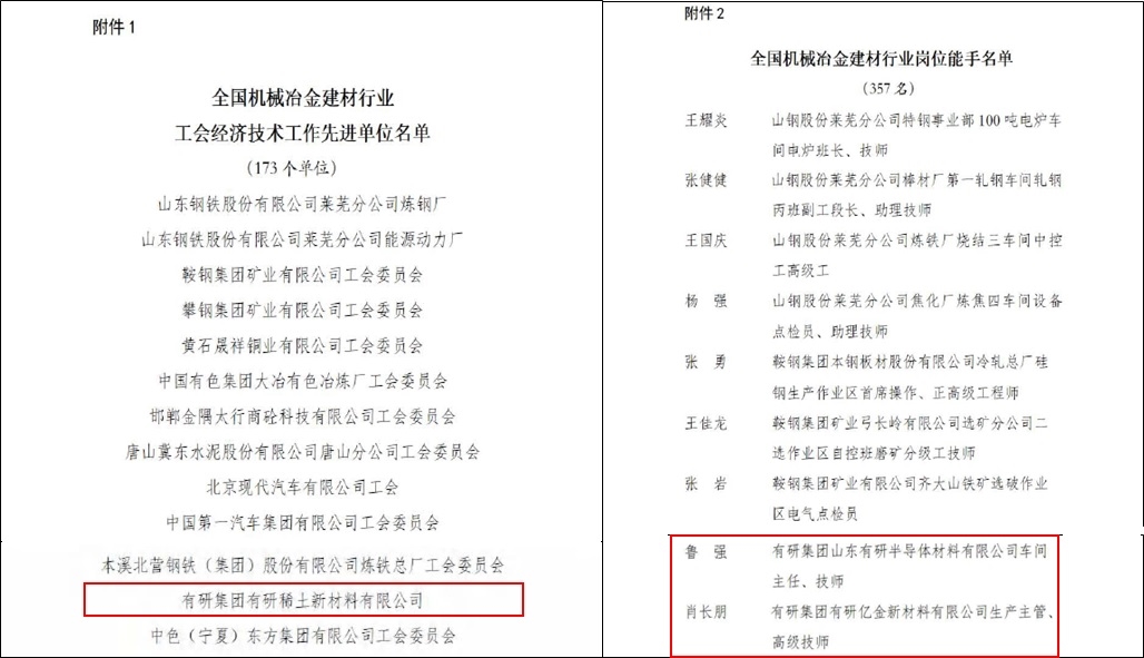 近日,中國機械冶金建材職工技術(shù)協(xié)會表彰了2022年全國機械冶金建材行業(yè)工會經(jīng)濟技術(shù)先進(jìn)單位和崗位能手。有研集團有1家產(chǎn)業(yè)單位和2名產(chǎn)業(yè)工人獲此榮譽。