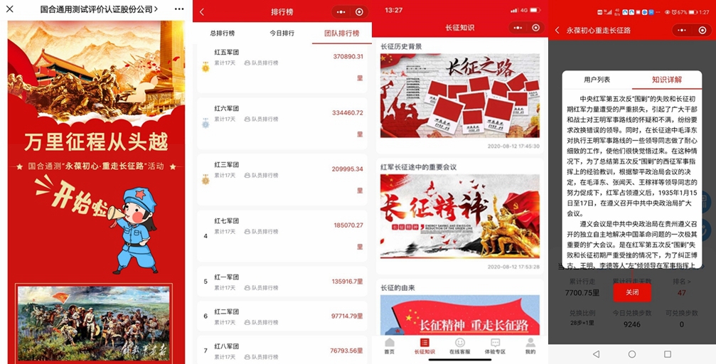 自3月15日起,國合通測7個黨支部分別命名為紅軍長征中的7個軍團,以每日線下行走步數(shù)兌換線上里程,力爭七一前人均走完25000里(行軍標(biāo)準(zhǔn)為每日人均至少7100步)。同時通過“重走長征路”程序,專題學(xué)習(xí)黨史知識。每到達紅軍長征標(biāo)志性地點,可點擊彈框?qū)W習(xí)相關(guān)知識。