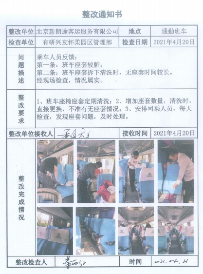 “是換新班車了嗎?怎么這么干凈!”面對煥然一新的班車,乘坐員工發(fā)出了感嘆。4月16日,綜合管理部在收到員工反映問題后第一時(shí)間與班車管理單位溝通,經(jīng)過現(xiàn)場檢查后立即聯(lián)絡(luò)協(xié)調(diào),由班車管理單位責(zé)令新朗途客運(yùn)公司對衛(wèi)生問題進(jìn)行整改,并由司乘人員進(jìn)行定期監(jiān)督檢查。為員工營造一個(gè)舒適、良好的通勤環(huán)境。