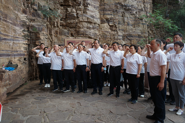 接下來,黨員們沿著紅旗渠建設(shè)者的足跡,重走“水長(zhǎng)城”,參觀了紅旗渠的分水樞紐——分水閘,徒步登上紅旗渠咽喉工程——青年洞。在青年洞前,大家面向鮮紅的黨旗重溫入黨誓詞,莊嚴(yán)宣誓,鏗鏘有力的誓言在青翠的山谷間久久回蕩。