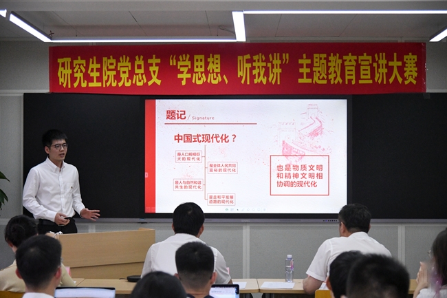 比賽環(huán)節(jié),10名宣講員依次上場,圍繞深入學(xué)習(xí)領(lǐng)會(huì)黨的二十大精神和習(xí)近平新時(shí)代中國特色社會(huì)主義思想,從政治、經(jīng)濟(jì)、文化、科技等角度分享心得體會(huì),并結(jié)合生活實(shí)際,聯(lián)系自身感悟談理論、述政策、頌典型。碩士生李昊結(jié)合全國兩會(huì)闡發(fā)新時(shí)代中國式民主的內(nèi)涵,博士生朱學(xué)哲用數(shù)據(jù)說話展現(xiàn)新時(shí)代偉大變革,博士生唐文濤回顧中國動(dòng)畫藝術(shù)發(fā)展史激發(fā)文化自信力量。